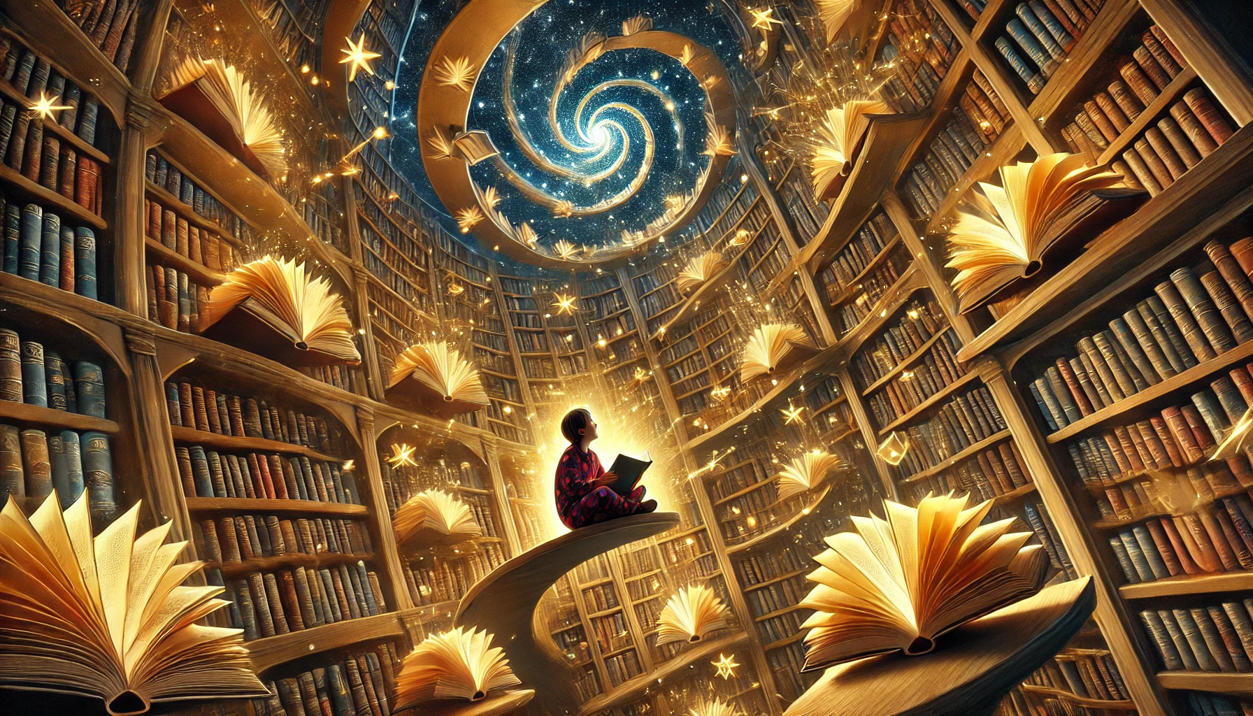 An impossible library where bookshelves spiral into infinity like an Escher painting, books are flying open with glowing golden letters streaming out of them forming constellations on the ceiling, a small child in pajamas sitting cross-legged reading while floating mid-air, warm magical atmosphere, detailed illustration