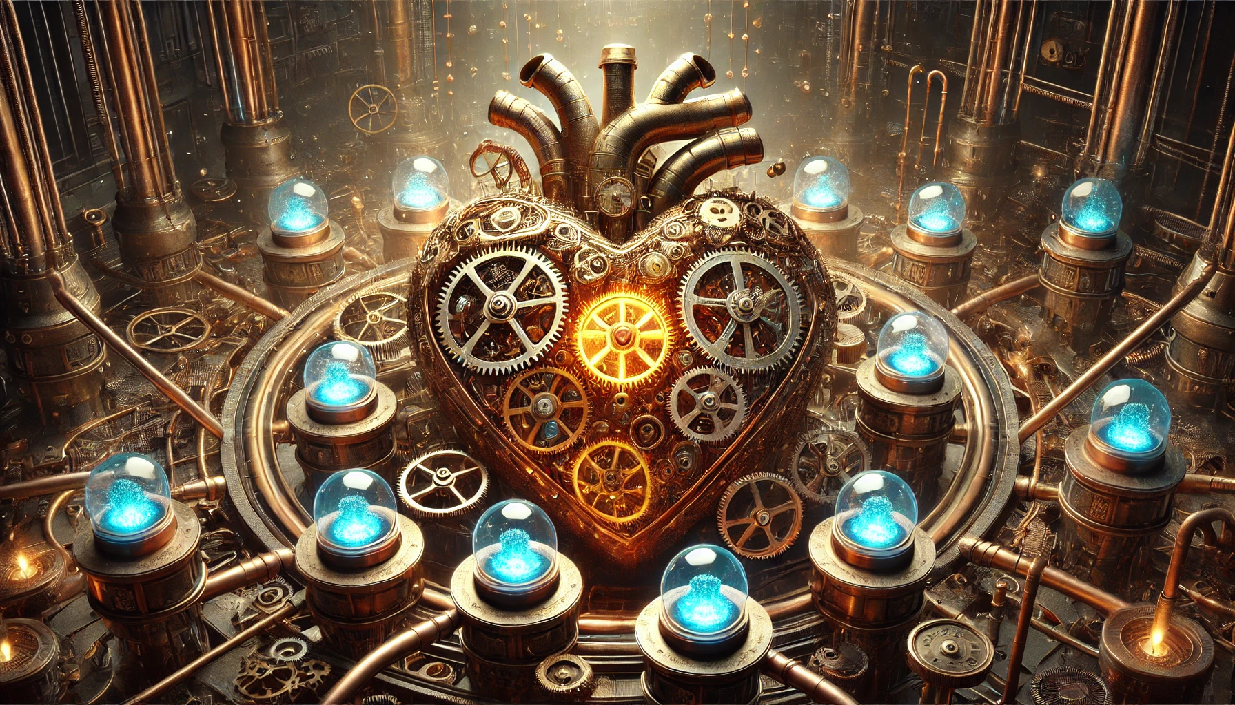 A massive steampunk clockwork heart made of brass gears, copper pipes, and crystal chambers filled with glowing blue liquid, tiny mechanical birds perched on the valves, the whole mechanism is slowly ticking and pulsing with light, dark industrial background, hyper-detailed illustration