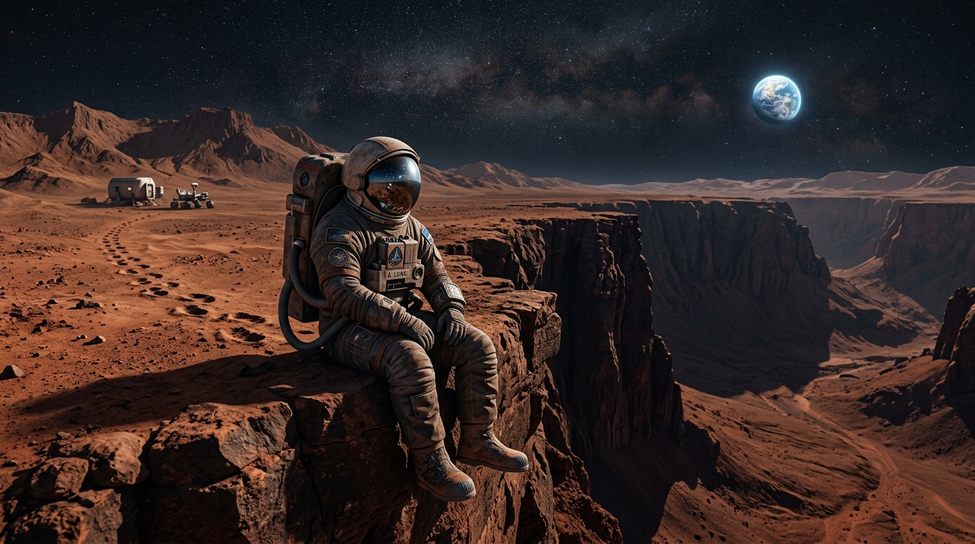 An astronaut sitting alone on the edge of a massive cliff on Mars, looking at Earth rising on the horizon like a small blue marble, dusty red terrain, footprints behind them, their visor reflecting the stars, melancholic cinematic composition, 4K