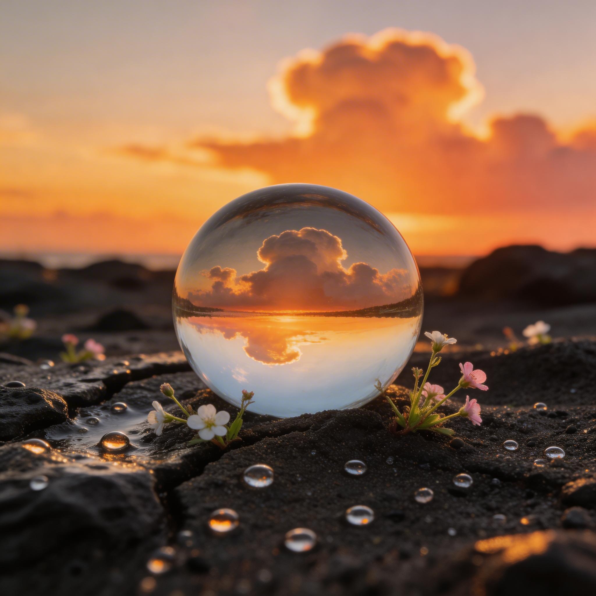 A crystal clear glass sphere on volcanic sand reflecting orange sunset, macro photography