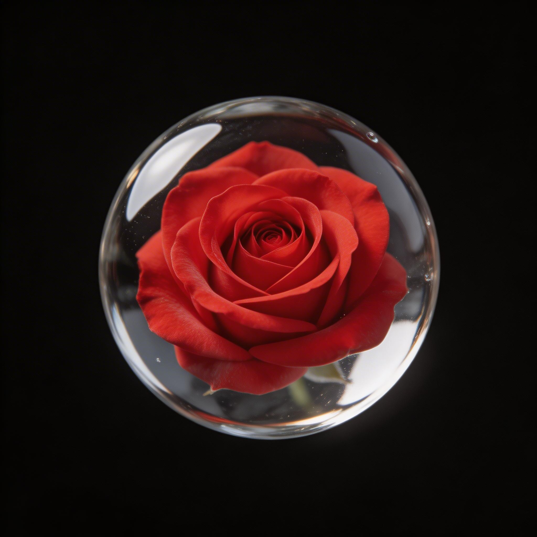 A perfect red rose floating in a crystal clear water droplet, macro, black background